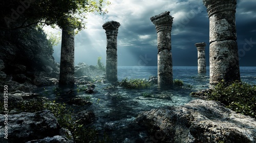 Ancient underwater ruins ocean floor scenic photography calm waters submerged perspective civilization discovery
