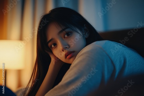 Beautiful Young Woman Pensive Portrait Soft Lighting Bedroom Girl Face Mood Dark Blue Warm Calm