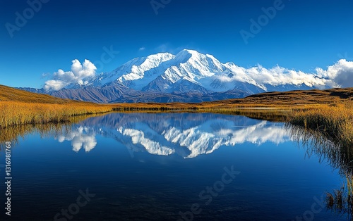 Denali mountain reflecting in a pristine alpine lake, surrounded by vast tundra, breathtaking panoramic views of Denali National Park, serene atmosphere, aweinspiring landscape