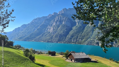 Malowniczy alpejski krajobraz z turkusowym jeziorem, zielonymi wzgórzami i drewnianymi domami, otoczony majestatycznymi górami, letni widok natury, Szwajcaria.