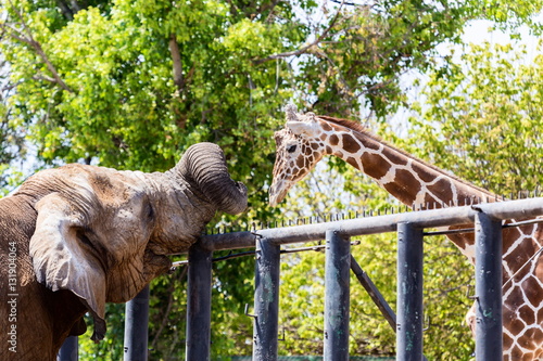 This African elephant and giraffe are unlikely friends forced together in the confines of a zoo. In the wild this would never happen as they would have their own family herd.