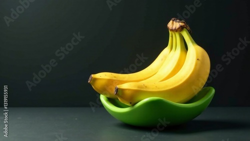 A vibrant bunch of ripe yellow bananas artfully arranged in a sleek, lime-green bowl, set against a dramatic dark background.