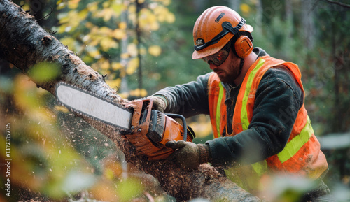 Worker in bright orange vest and helmet skillfully uses a chainsaw to cut a fallen tree in a forest clearing surrounded by autumn foliage