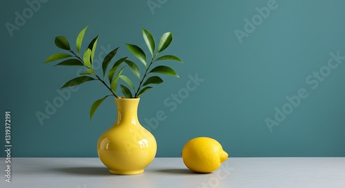 Yellow vase with leaves and lemon - freshness and simplicity - stock photography, home decor, advertising.