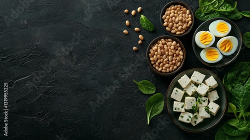 High-protein food selection including boiled eggs, beans, tofu, and spinach on a dark textured background, vibrant colors, soft shadows