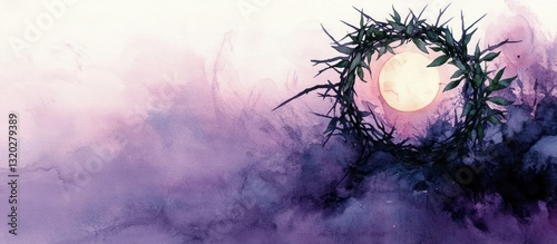 Crown of Thorns Green Leaves Full Moon Misty Landscape Watercolor Painting Christian Art
