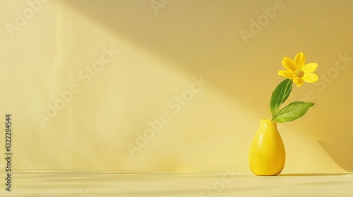 A yellow vase with a yellow flower on a yellow background and a shadow of a nearby wall