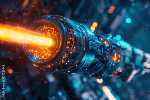 Futuristic energy weapon emitting bright plasma in a high-tech environment with glowing circuits