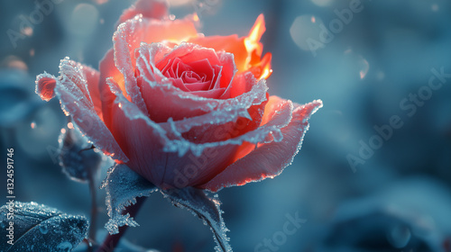 A frozen rose with fire licking its petals, the edges glowing red while the center remains icy blue.