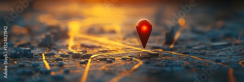 Red GPS Location Pin On Illuminated City Map At Sunset, Modern Wayfinding And Navigation Concept