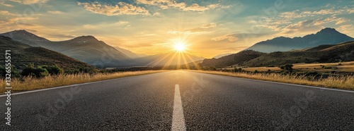 Driving Into the Sunset Asphalt Road Leading to Mountain Range