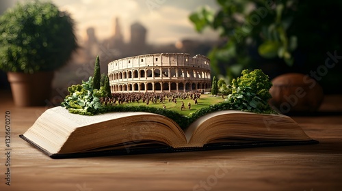 Captivating image of the grand Roman Colosseum emerging from the pages of an open book transporting the viewer to the heart of ancient Roman civilization and its legendary gladiatorial spectacles