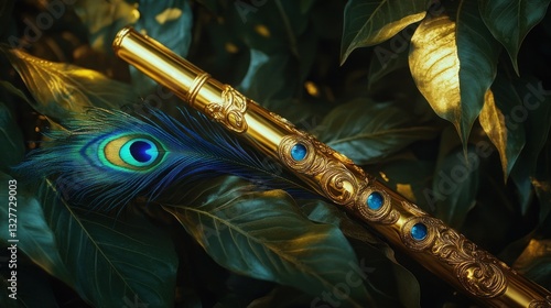 Golden flute resting on lush foliage. A beautiful flute, intricately designed in gold, sits amongst vibrant green leaves. A peacock feather with a striking blue eye adds a touch of elegance