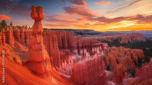 an otherworldly landscape featuring towering hoodoos with vibrant red and orange hues, sculpted over millennia by wind and water erosion, set against a dramatic sunset sky.