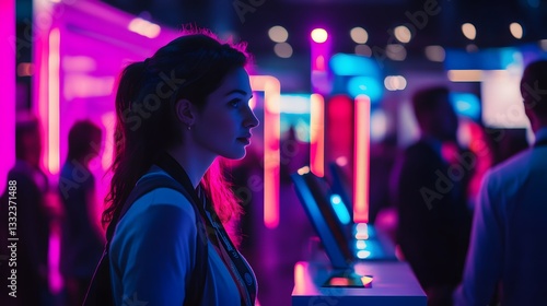 Woman enthusiastically engaging with cutting-edge technology at a vibrant tech fair filled with innovative displays