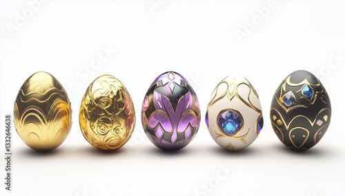Kolorowe Jajka Faberże na jasnym jednolitym tle, ilustracja 3D. Colorful Faberże Eggs on a light plain background, 3D illustration.