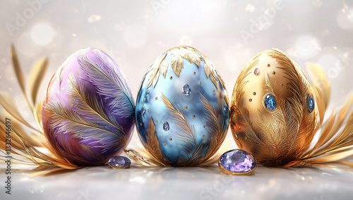 Kolorowe Jajka Faberże na jasnym jednolitym tle, ilustracja 3D. Colorful Faberże Eggs on a light plain background, 3D illustration.