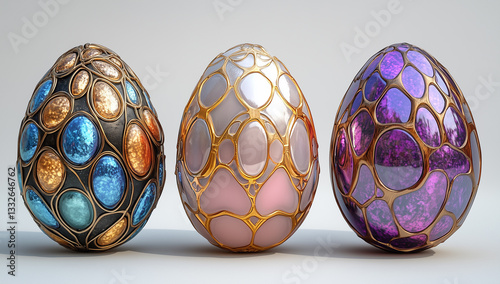 Kolorowe Jajka Faberże na jasnym jednolitym tle, ilustracja 3D. Colorful Faberże Eggs on a light plain background, 3D illustration.