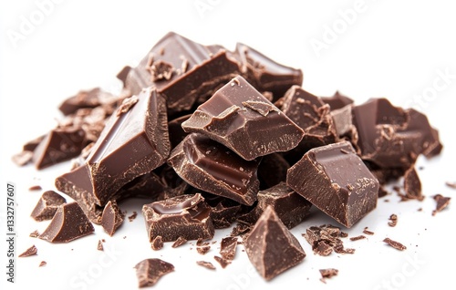 Pile of Rich Dark Chocolate Chunks on White Background Closeup