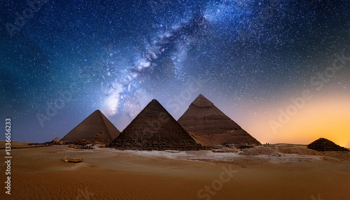Egyptian pyramids illuminated under starry night sky. Milky Way above ancient monuments.
