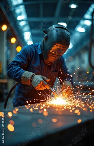 Metalworker welds in industrial workshop. Man uses welding torch, creates sparks. Late evening, bright lights. Craftsman wears helmet, safety gear, fabricates steel with skill, precision, artistry,