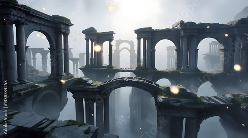 abandoned skyborne ruins shrouded in mist with traces of lost civilization for fantasy artwork book covers and immersive visual worlds