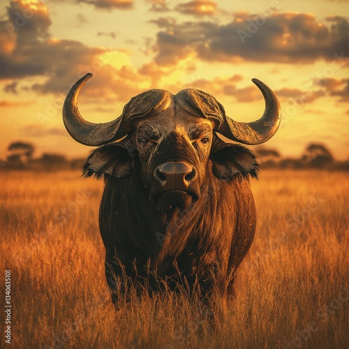 Majestic Cape Buffalo Standing Proudly in an Open Savanna at Sunset with Dramatic Clouds in the Background