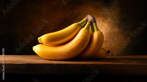 Elegant still life with a bunch of bananas resting on a rustic wooden surface