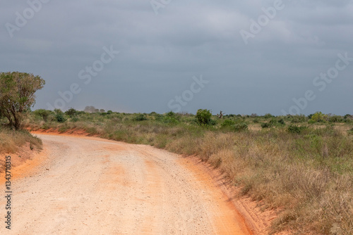 pomarańczowa droga biegnącą przez sawannę w Kenii