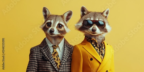 Suave Raccoons: Two fashionable raccoons, one in a sophisticated suit and the other in a stylish yellow jacket with sunglasses, exude an air of charm and elegance against a vivid backdrop.