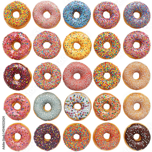 A Grid of Numerous Donuts with Assorted Glazes and Sprinkles, Arranged in a Pattern Against a White Background.