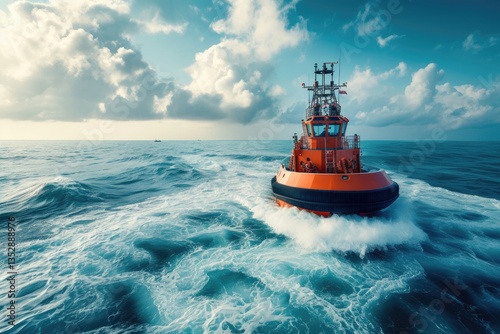A vibrant orange tugboat navigates choppy ocean waters under a dramatic sky.
