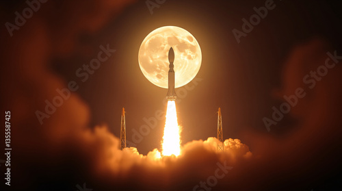 Rocket launching into space under a full moon, with bright flames and smoke trailing behind.