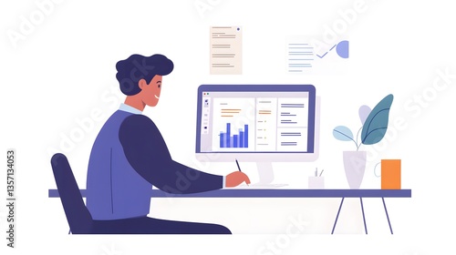 Data Analyst's Desk: An illustrated data analyst, engrossed in financial analysis, meticulously reviewing charts and documents on a digital screen.