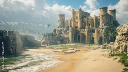 Ancient ruins civilization eroded concept. A stunning coastal scene featuring a majestic ancient castle surrounded by lush greenery and sandy beach, set against dramatic skies.