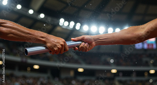 Dynamic relay race baton handoff with motion blur, intense stadium lights