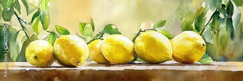 Sunlit Lemons on Wooden Board - Watercolor painting of lemons on a wooden surface, symbolizing freshness, vitality, summer, nature, and abundance