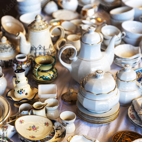Assortment of vintage porcelain tableware with gold trim at a flea market