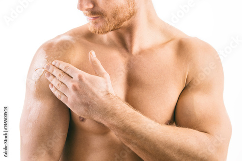 Testosterone Replacement Therapy (TRT) - Muscular man applying testosterone gel on shoulder