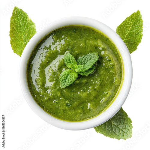 Top view of green mint chutney in a white bowl with mint leaf garnish