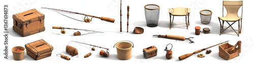 3D fishing equipment set. Fishing rod, tackle box, bait bucket, fishing net, folding chair, river, wooden pier for fishing, angling, and outdoor adventure, illustration