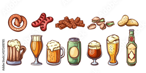 Beer pub or bar menu line icons set. Outline hand drawn beer glass bottle and mug, stein and aluminum can with salty snacks. Oktoberfest mascots, food and drink color icons vector illustration