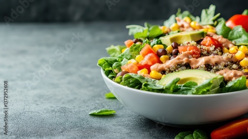 A delicious salad composed of quinoa, corn, avocado, and tomatoes, celebrating health-focused ingredients and the joy of eating nutritious meals.