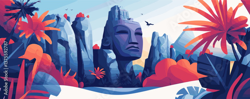 Surreal mountain landscape with giant stone head and exotic vegetation - vector.