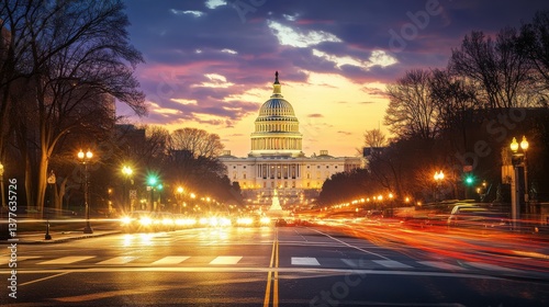 As the sun sets, a beautiful array of colors fills the sky over the Capitol building. Busy traffic flows along the streets, creating streaks of light against the twilight