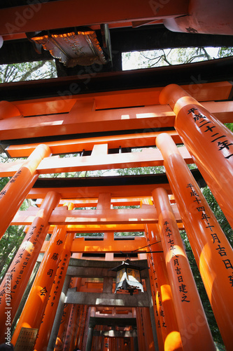 Red wooden torii gate in the territory of a Shinto temple in Kyoto, Japan. At the gates of the sacred religious teksty- Buddhist scriptures