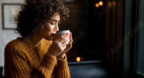 Young caucasian female enjoying a warm beverage indoors in cozy sweater
