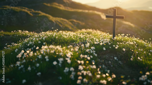 Serene hillside covered with fresh spring grass and tiny blooms, a simple wooden cross placed at the crest, photographed during golden hour