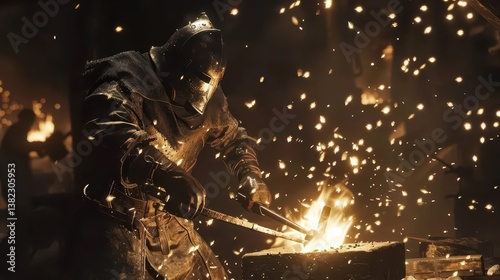 A blacksmith working at a forge, striking metal with sparks flying around.
