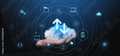 Cloud data storage and network access concept with digital icons on dark background.